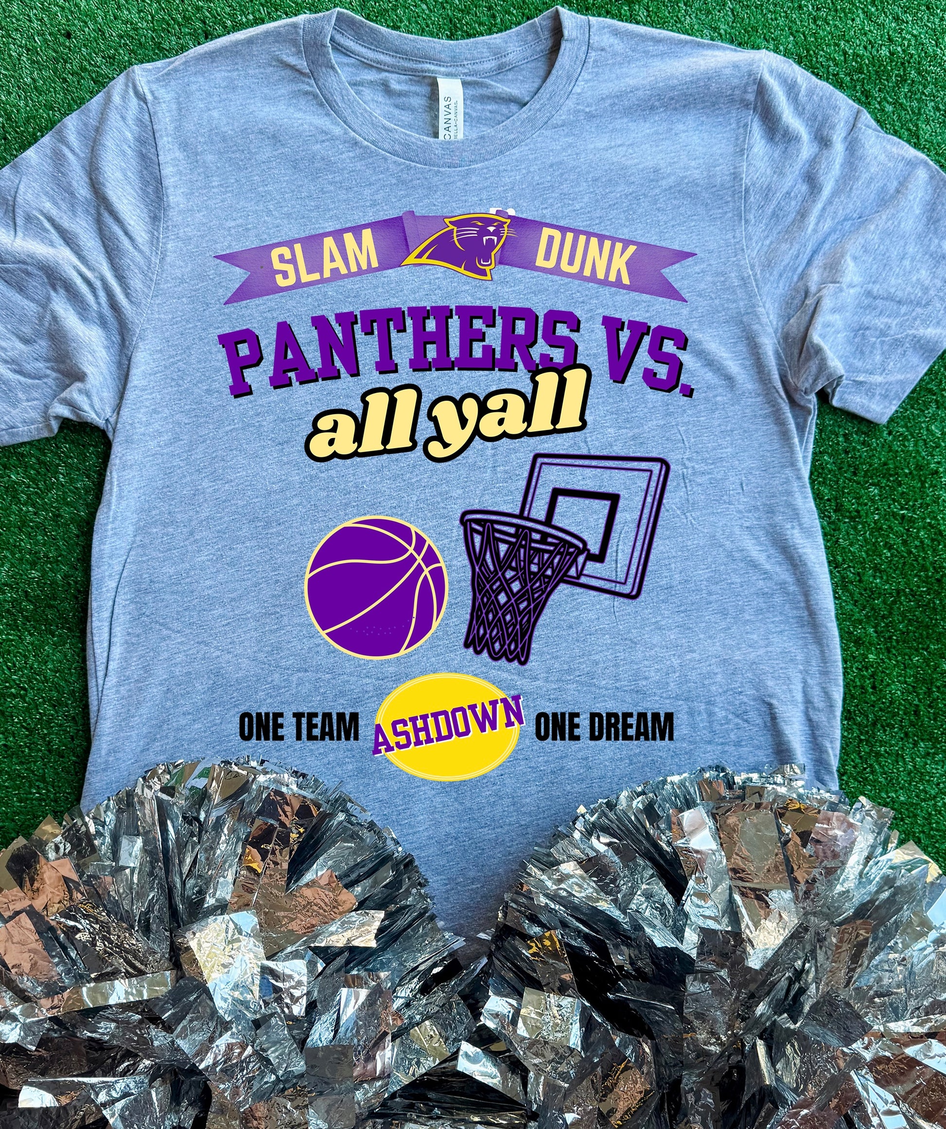 “Slam Dunk Panthers VS All Yall, One Team One Dream” on a Grey Short Sleeve Bella Canvas Tee.