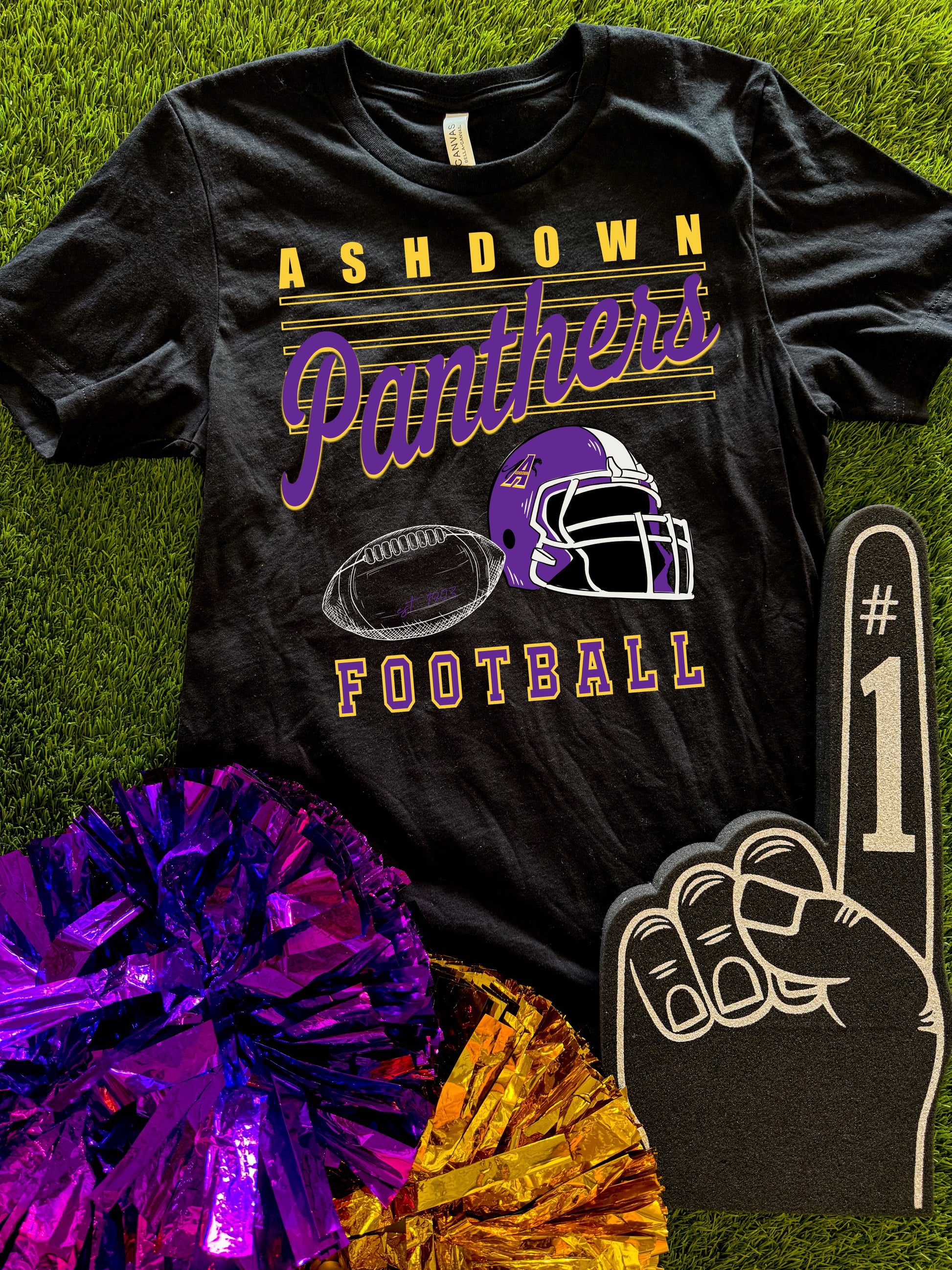 “Ashdown Panthers Football” on a Black Short Sleeve Bellas Canvas Tee