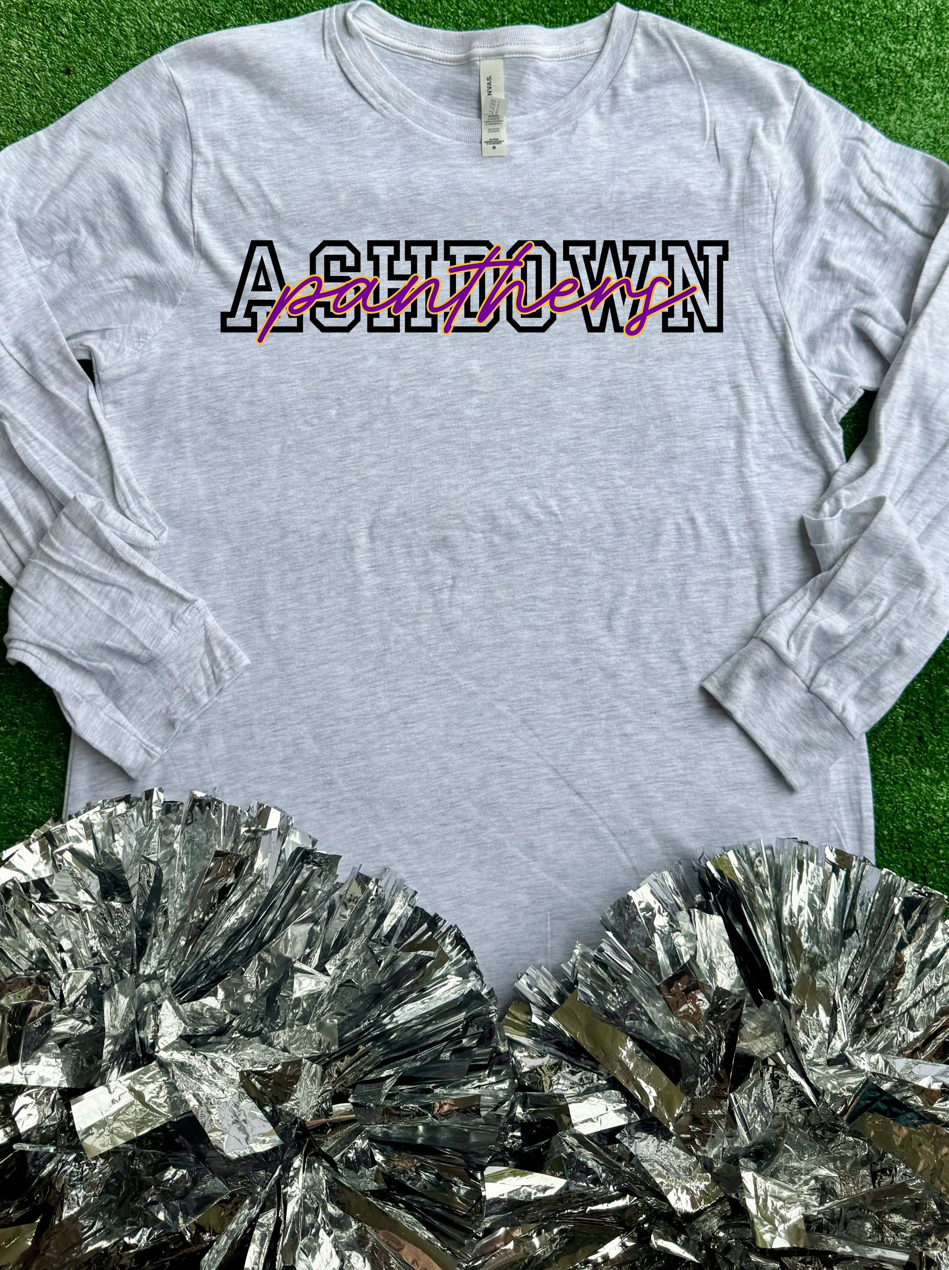 "Ashdown Panthers” on a Ash Grey Long Sleeve Bella Canvas Tee