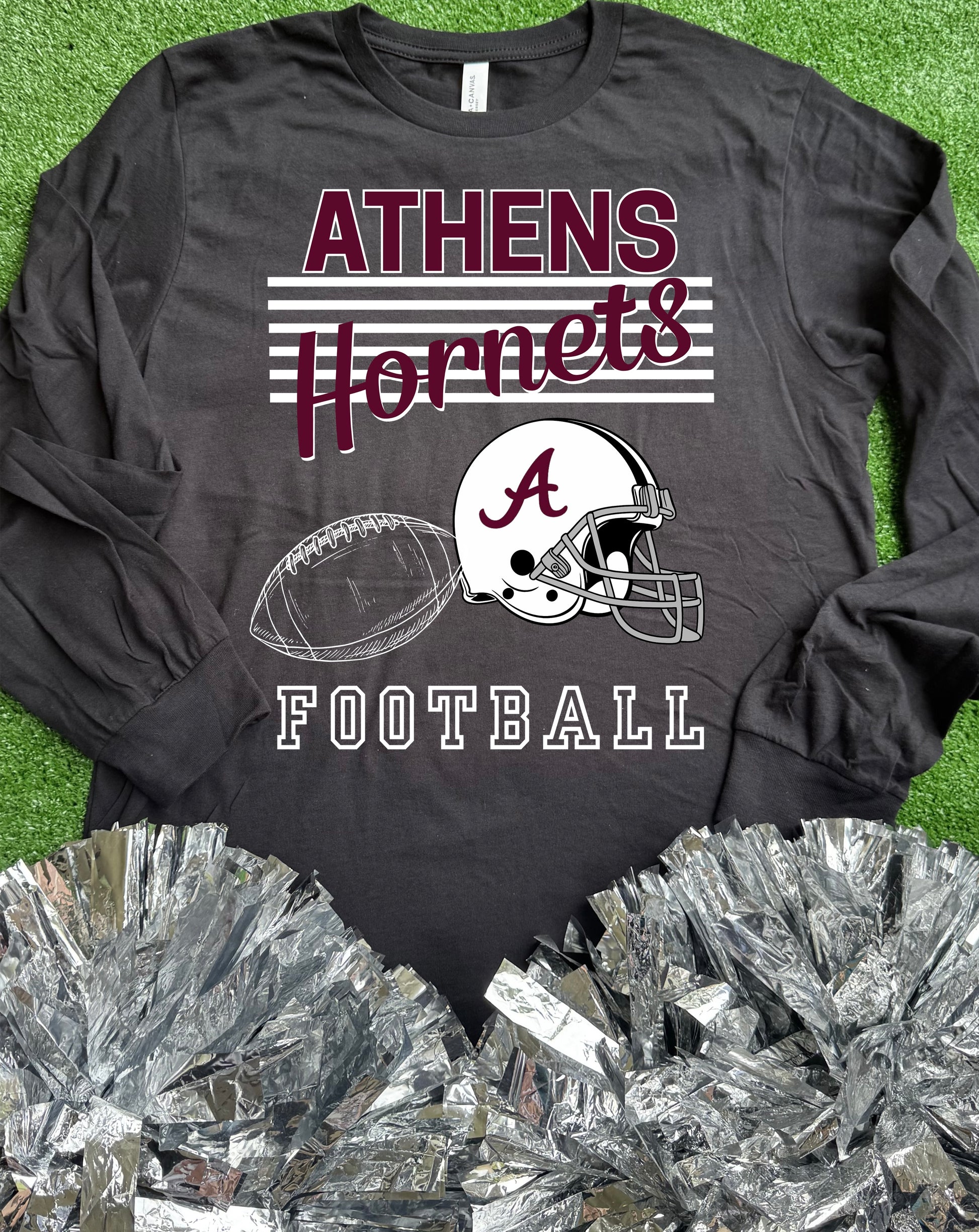 "Athens Hornets Football Graphic" on a Black Long Sleeve Bella Canvas Tee