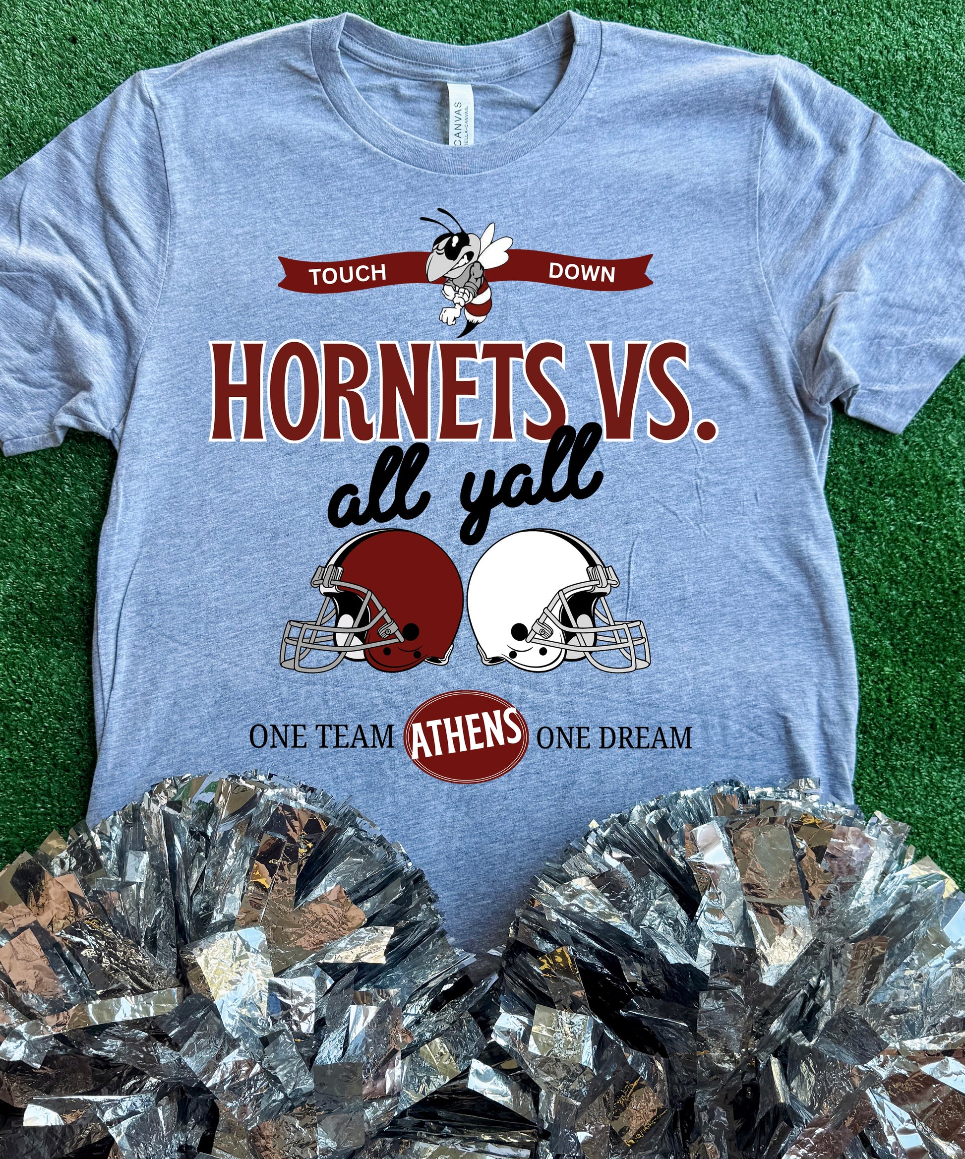 "Hornets VS All Yall, One Team One Dream" on a Grey short sleeve Bella Canvas Tee