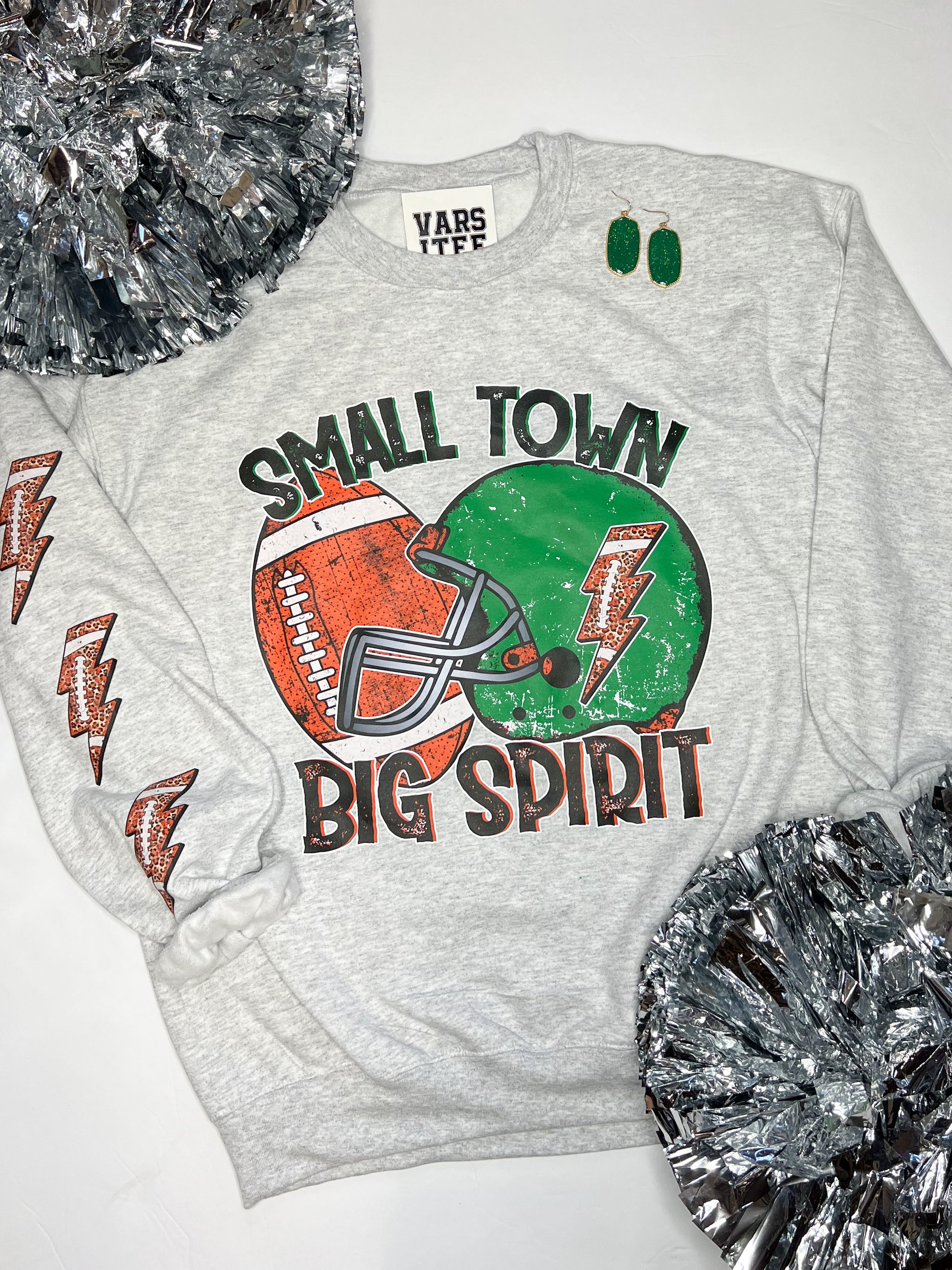 "Small Town Big Spirit" Football Graphic on a Ash Grey Sweatshirt. Football Lightening Bolt Detail on One Sleeve.