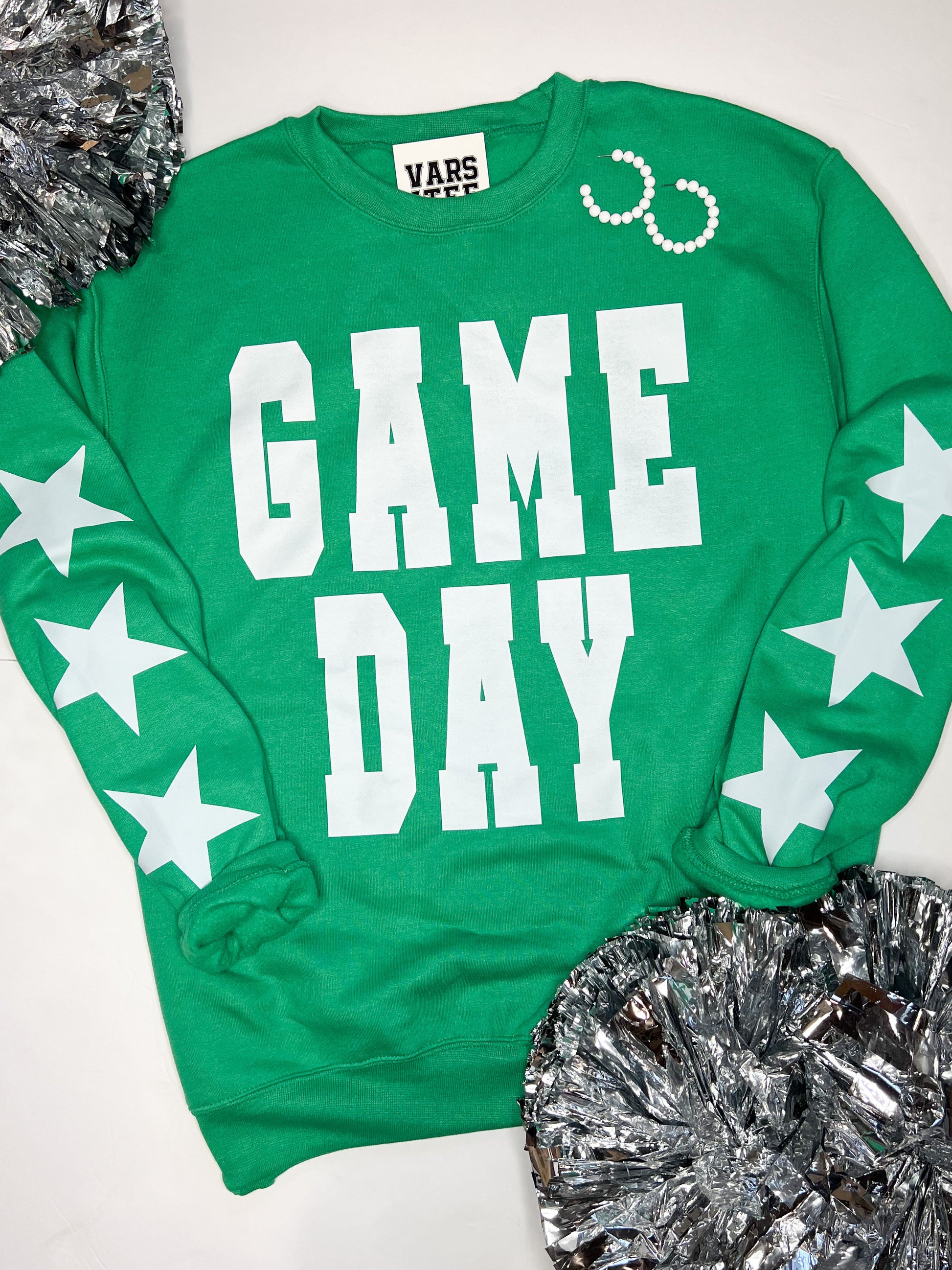 "Game Day" on a Kelly Green Gildan Sweatshirt. Star Detail Down The Sleeve.