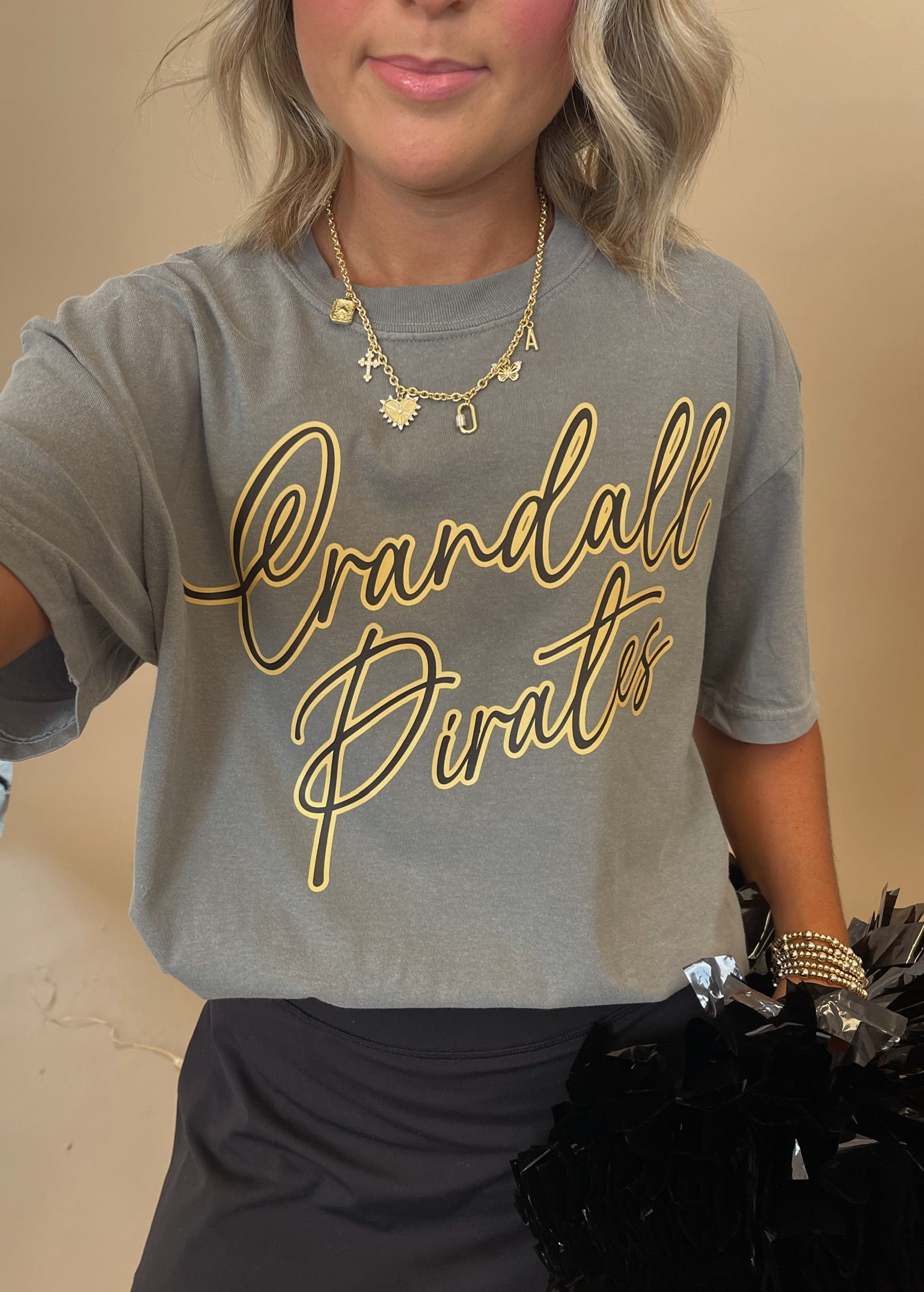 Crandall Pirates Cursive Outline Graphic on a Grey Comfort Color Tee.