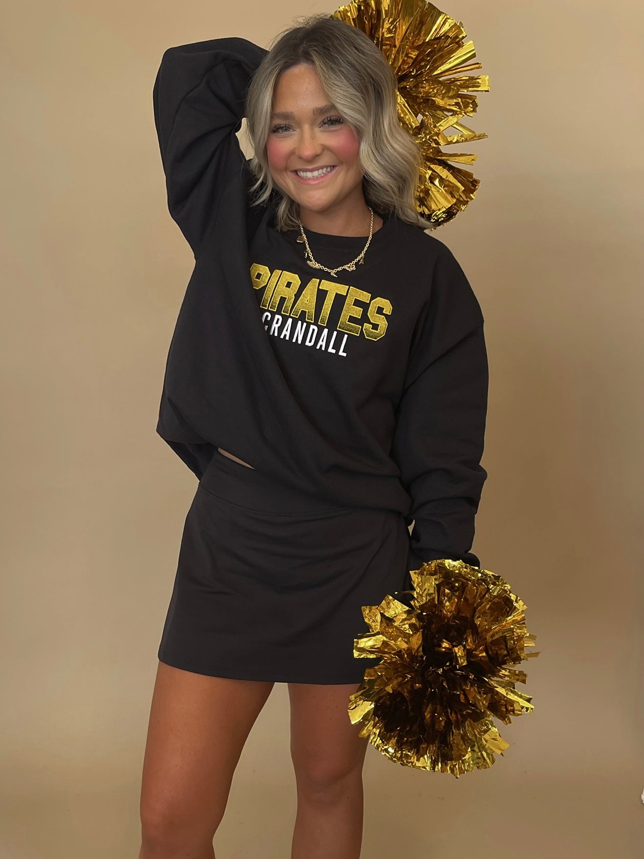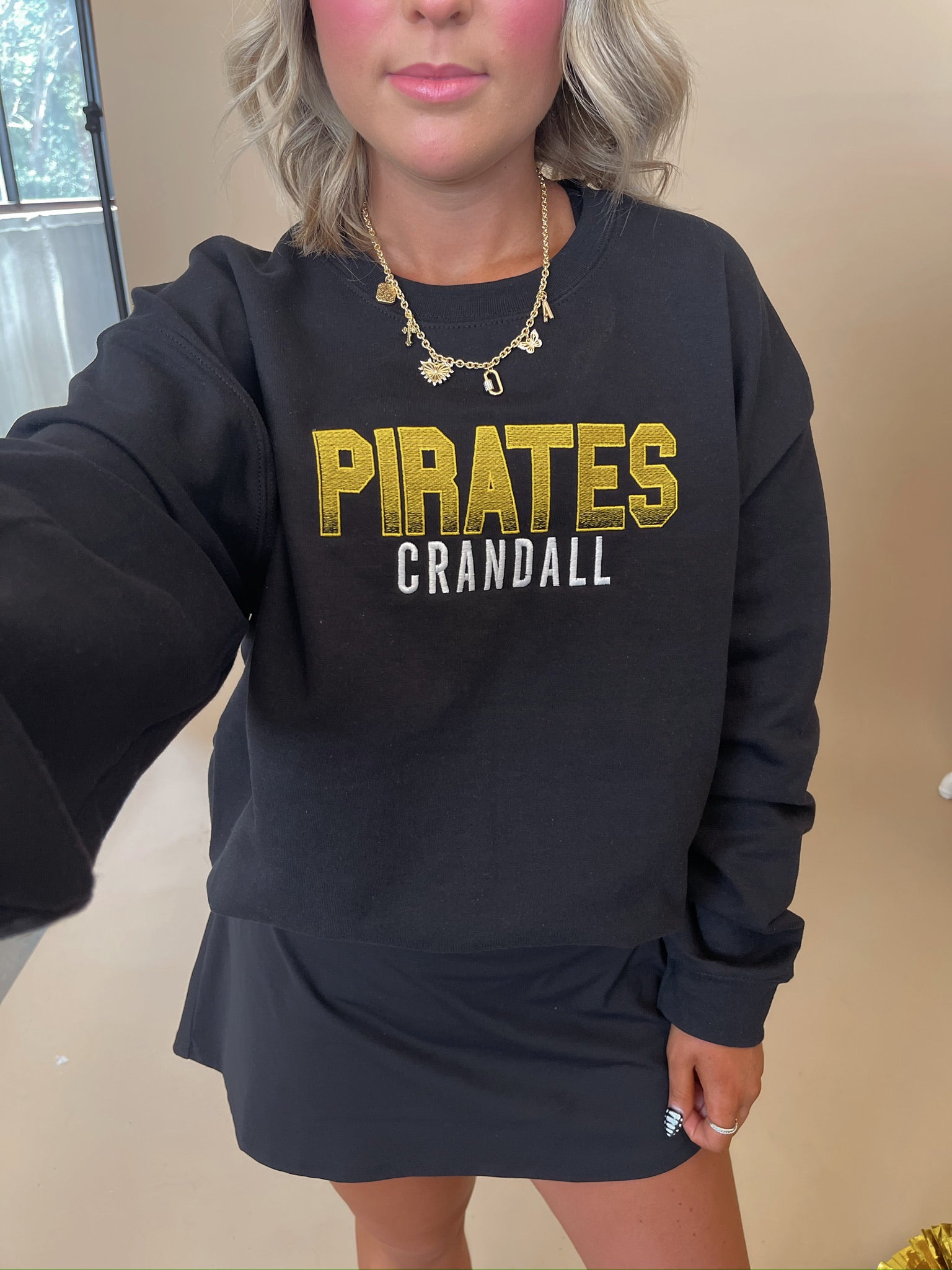 "Pirates Crandall" embroidered on a Black Gildan sweatshirt.
