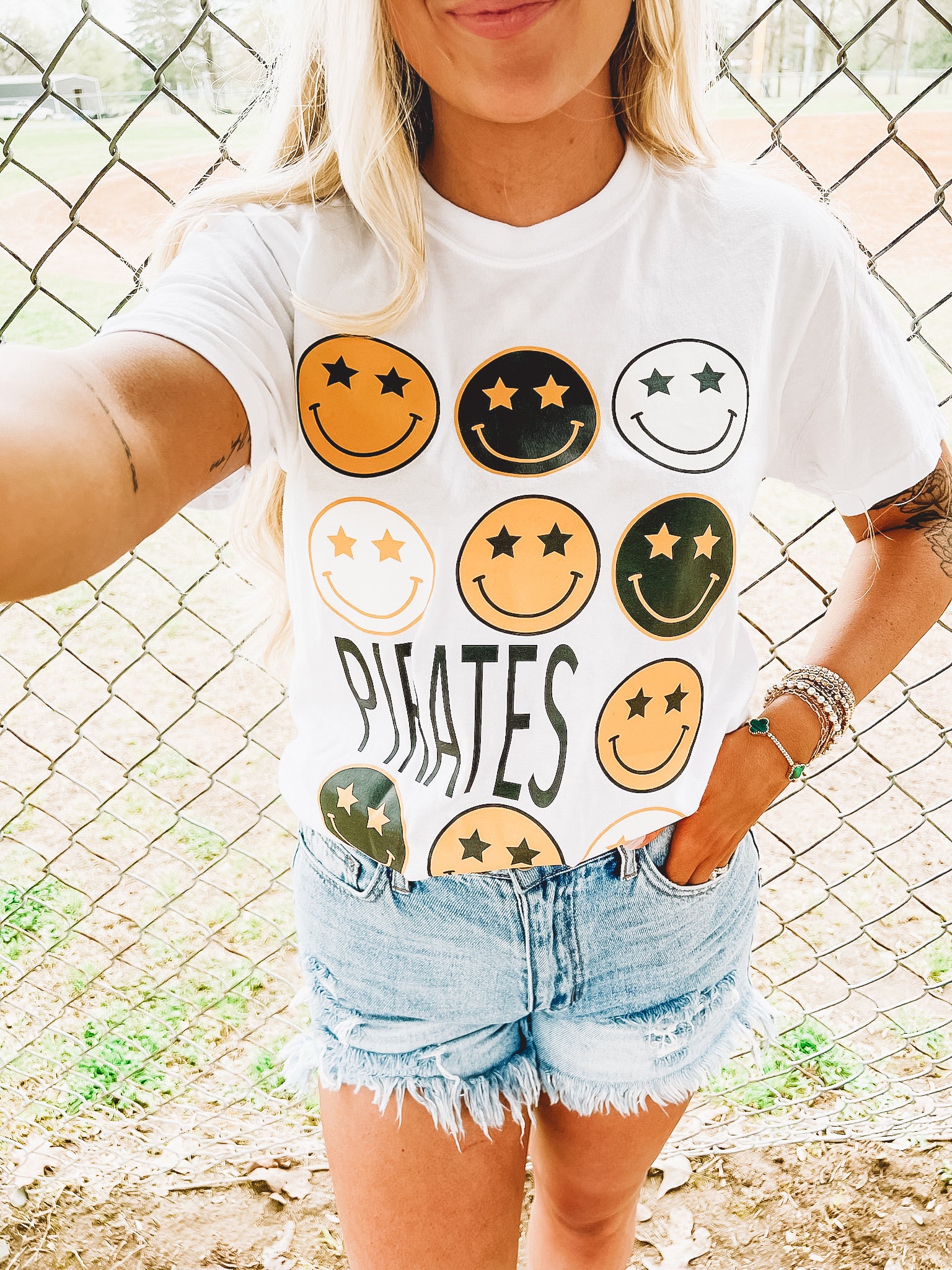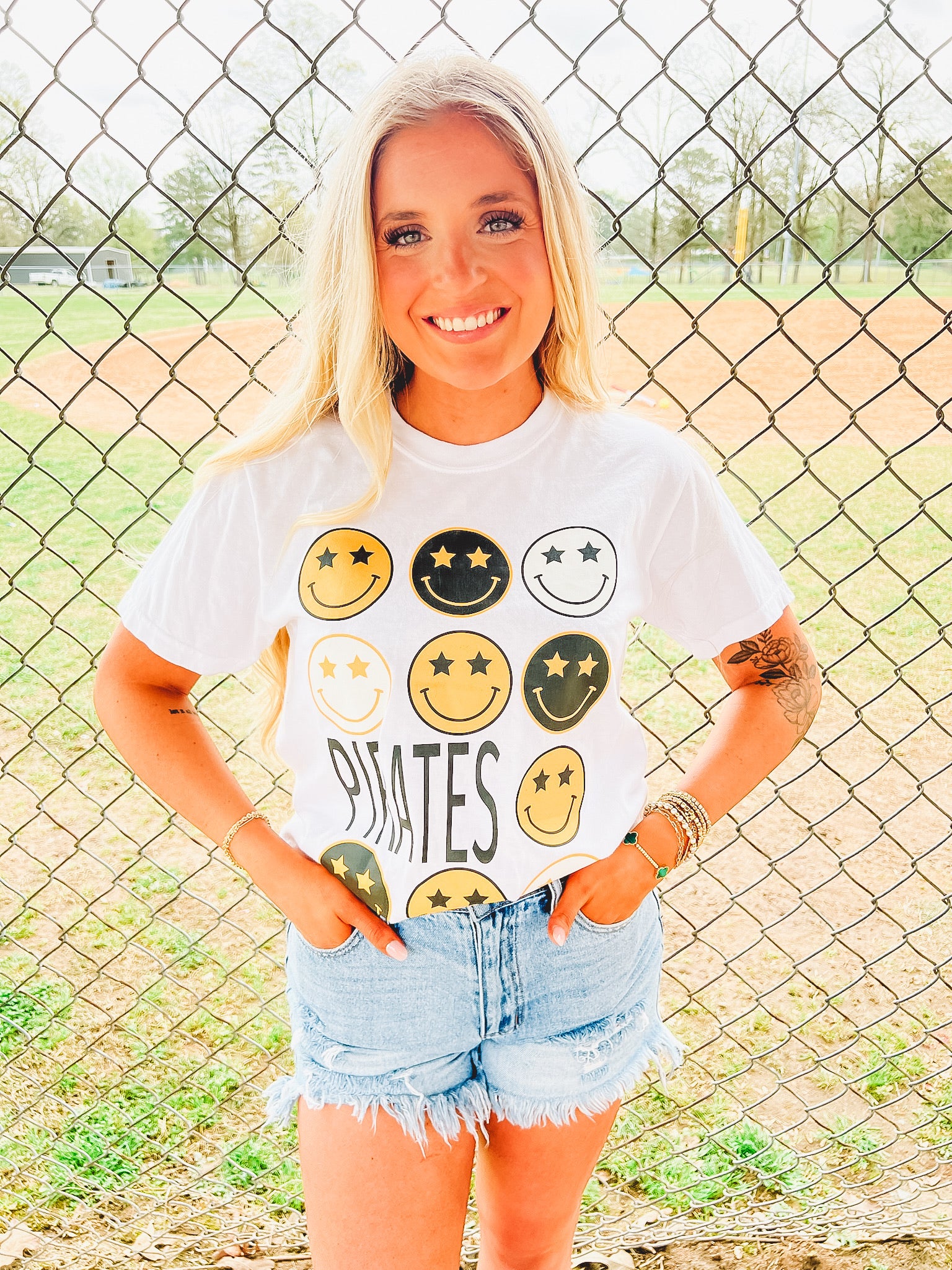 Crandall Smiley Face Graphic Print on a White Comfort Color Tee.