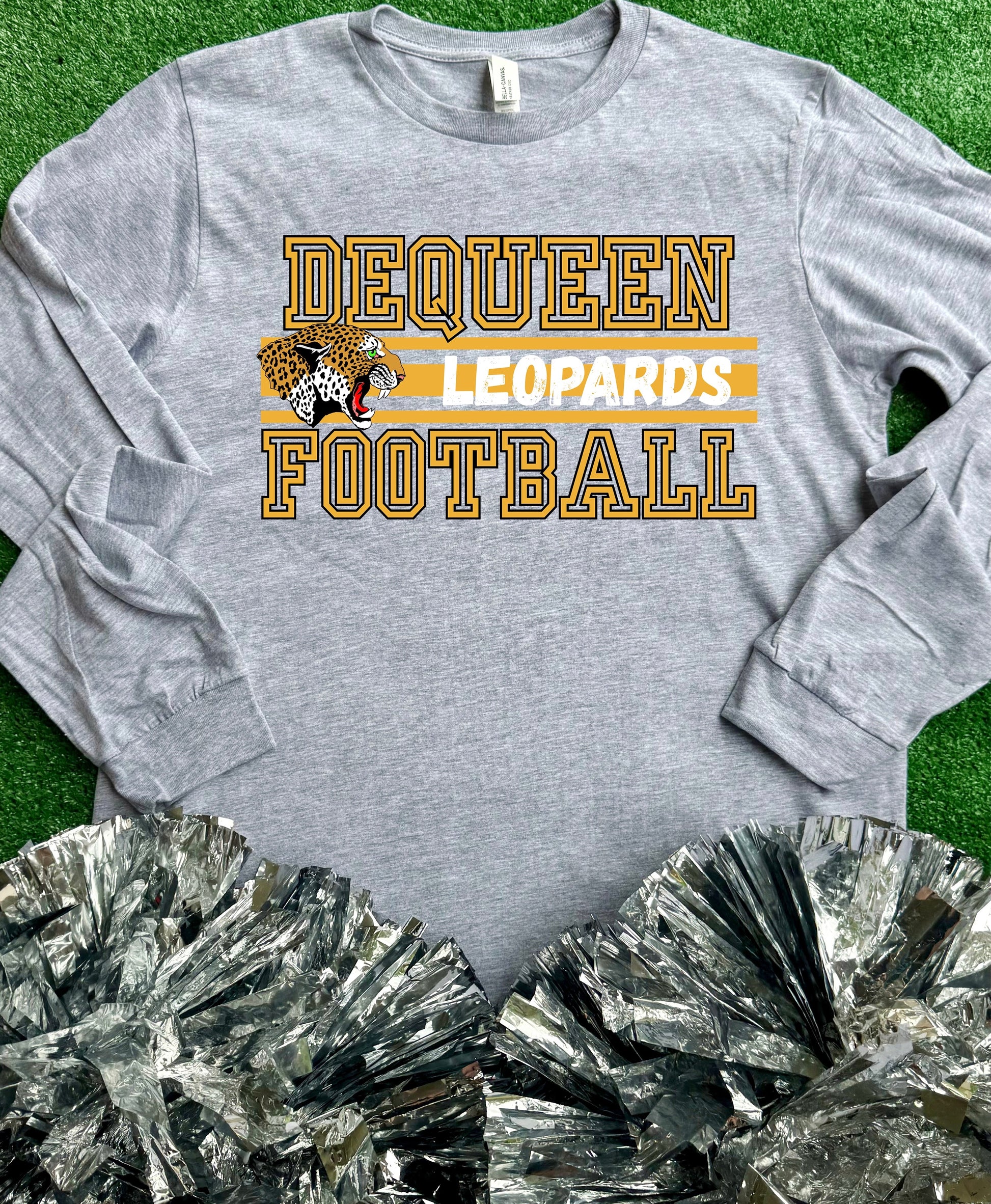 “DeQueen Leopards Football" on a Grey Long Sleeve Bella Canvas tee.
