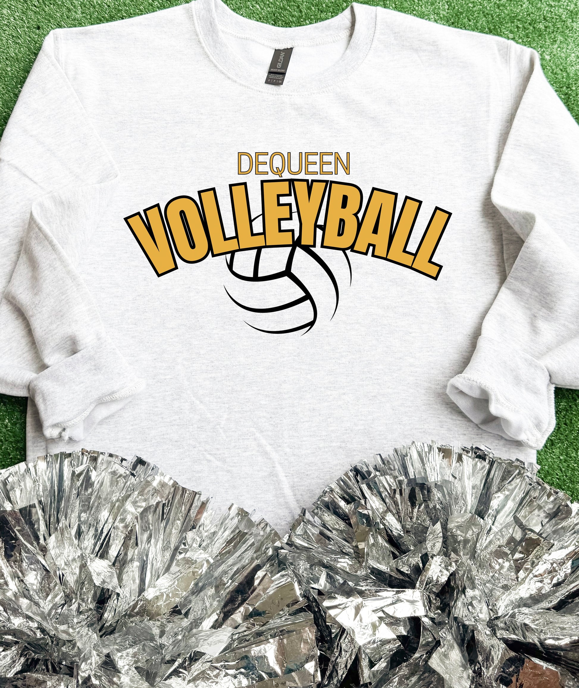 “DeQueen Volleyball” on a White Gildan Sweatshirt.