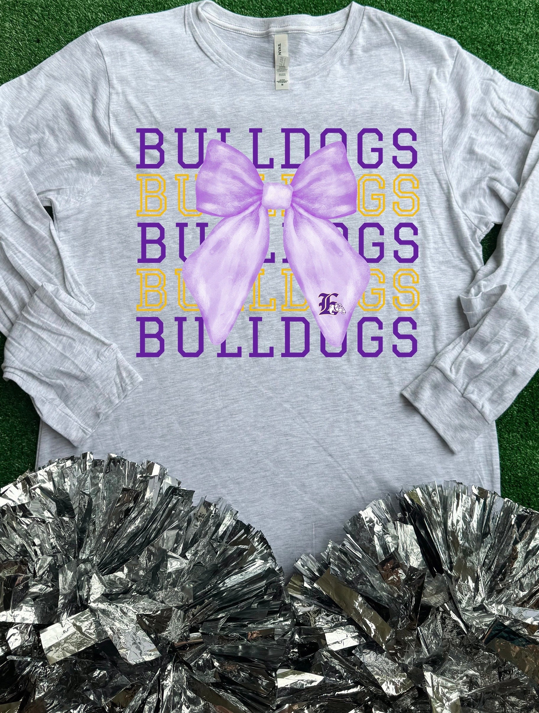 "Bulldogs” on an Ash Grey long sleeve Bella Canvas Tee.