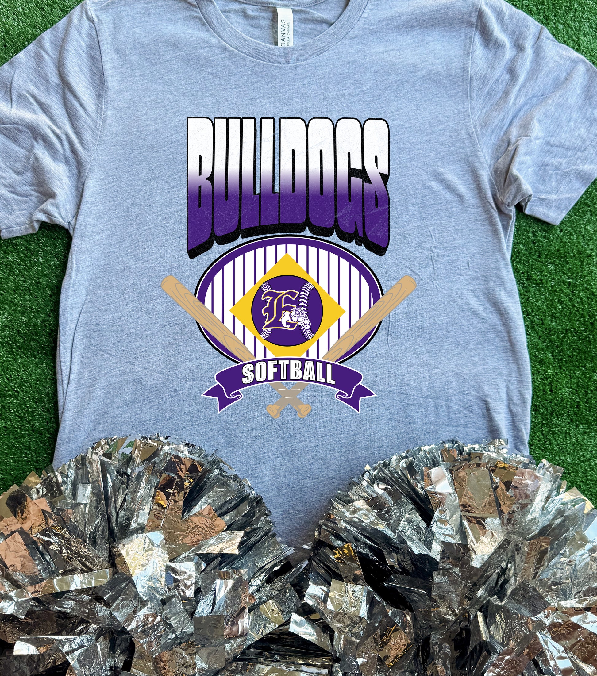 “Bulldogs Softball” on a Grey Short Sleeve Bella Canvas tee.