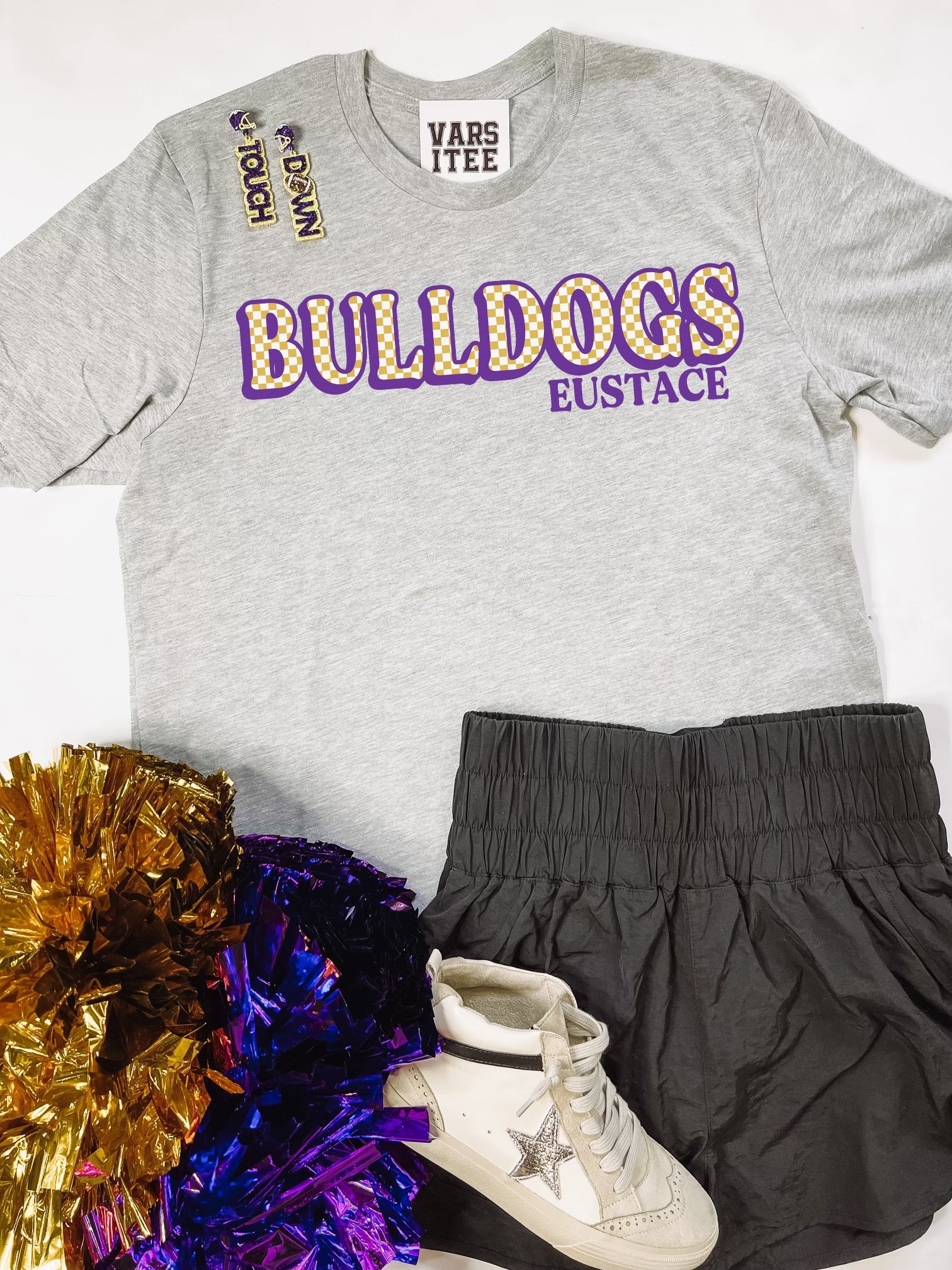 Checker Print Eustace Bulldogs on a Grey Tee.