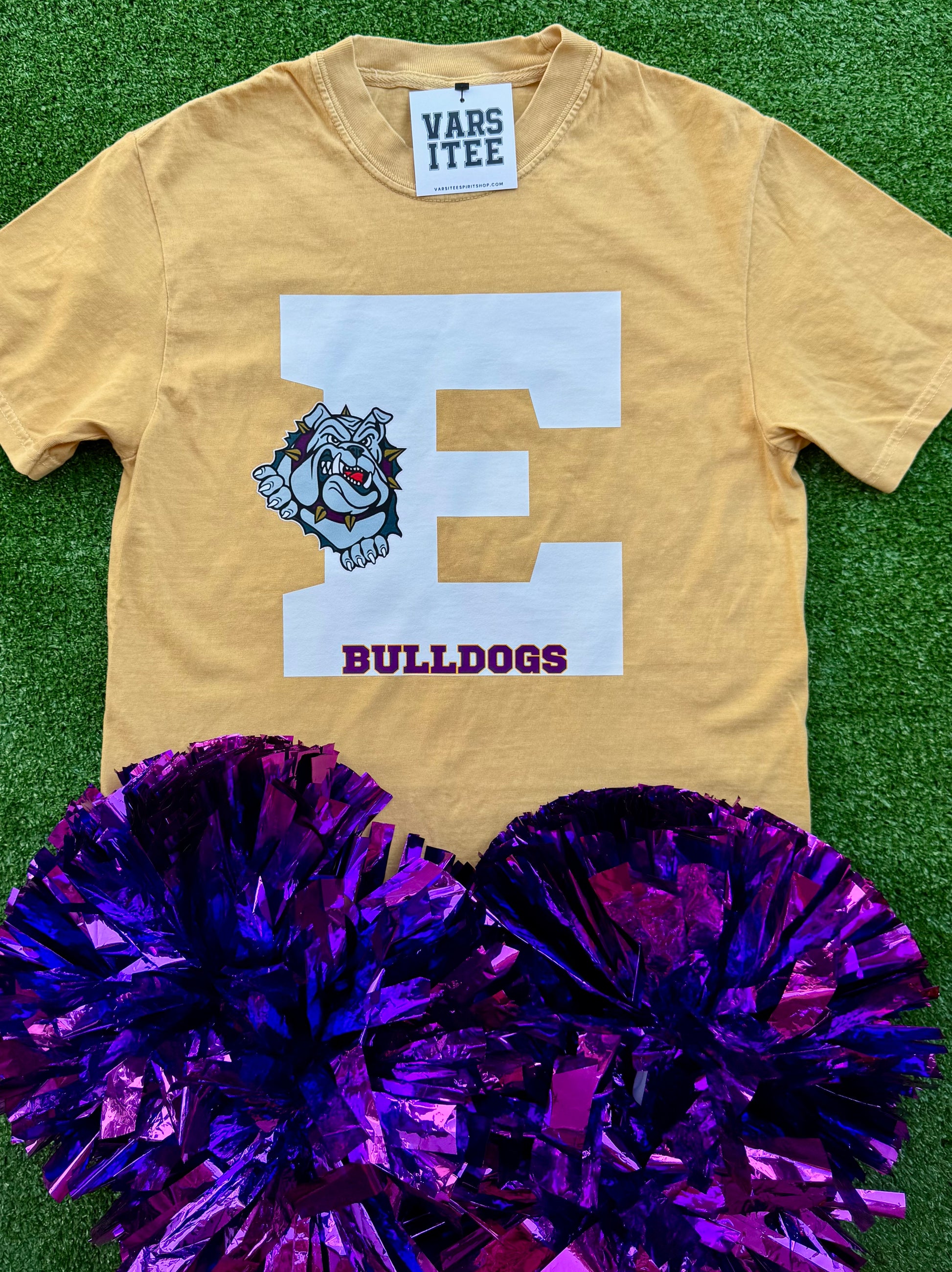 "Eustace Bulldogs Logo" on a Mustard Short Sleeve Comfort Colors Tee