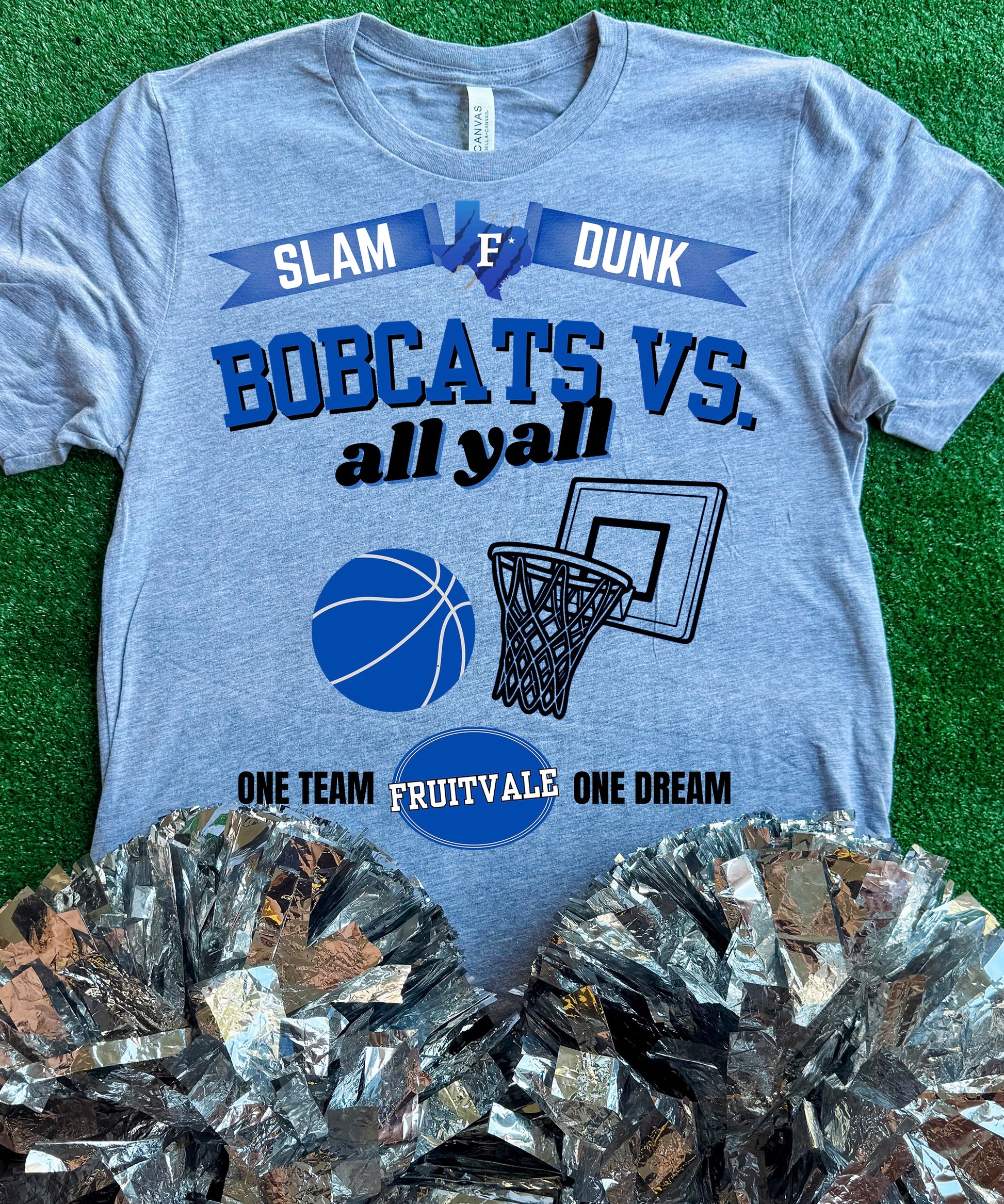 “Slam Dunk Bobcats VS All Yall, One Team One Dream” on a Grey Short Sleeve Bella Canvas Tee.