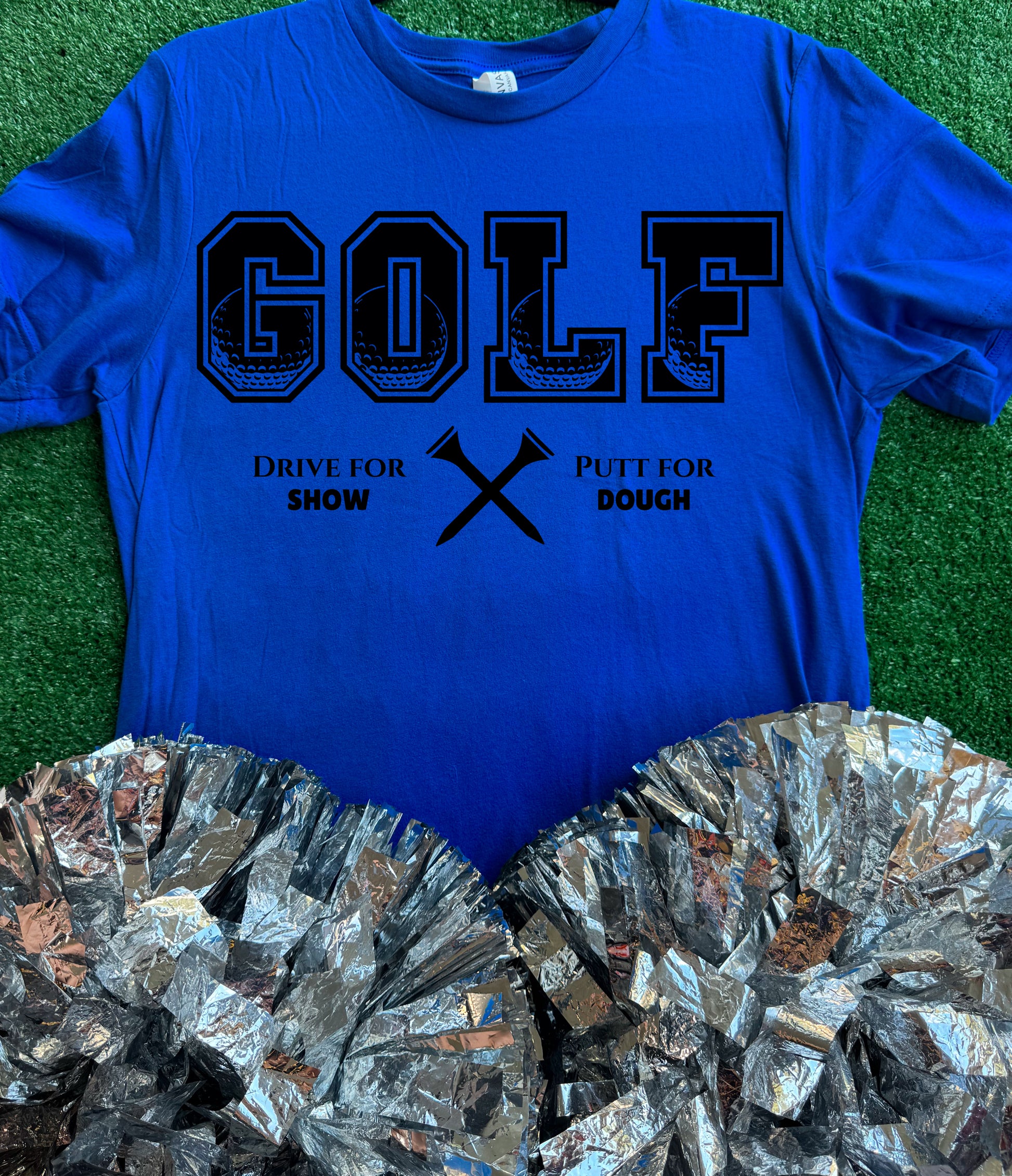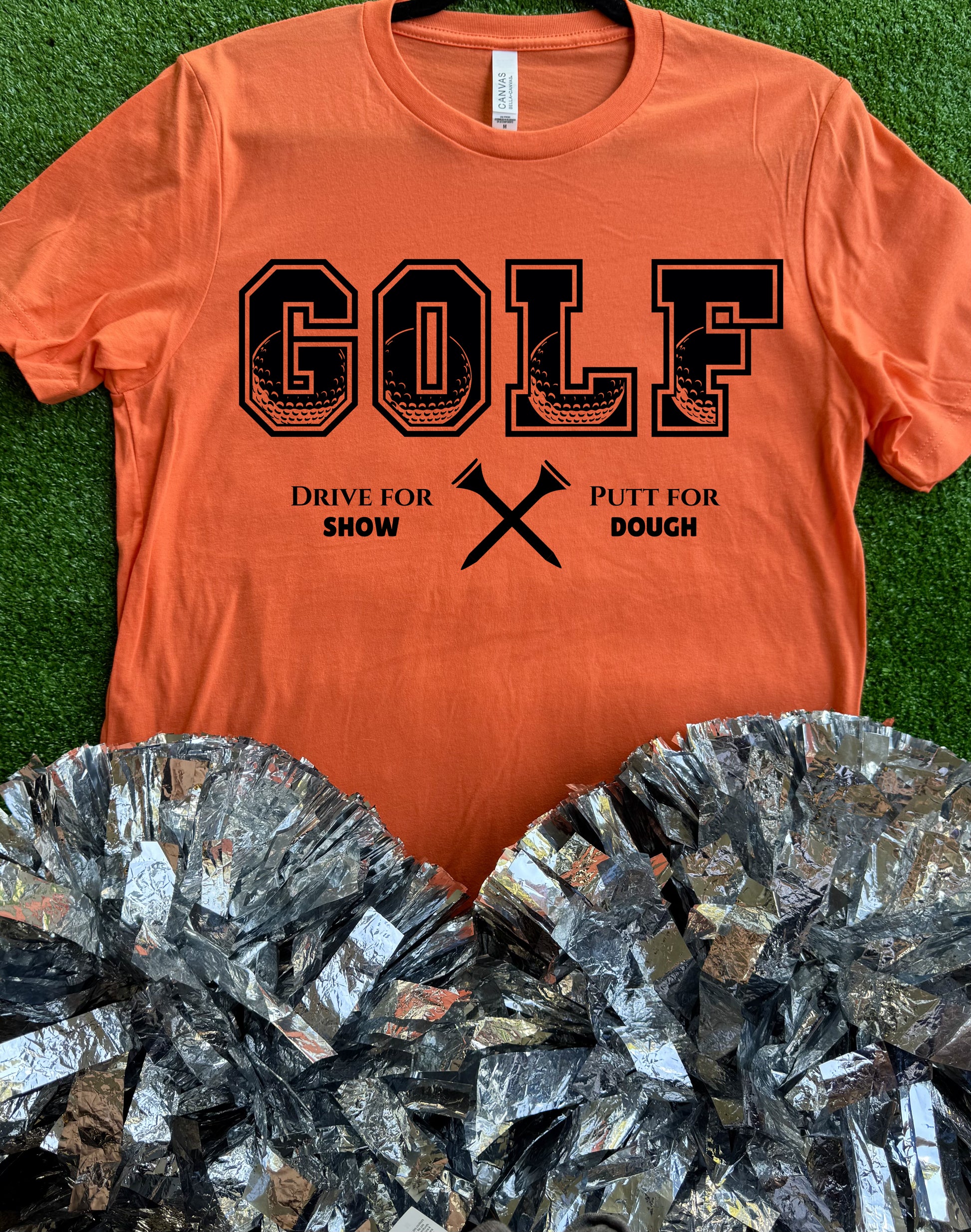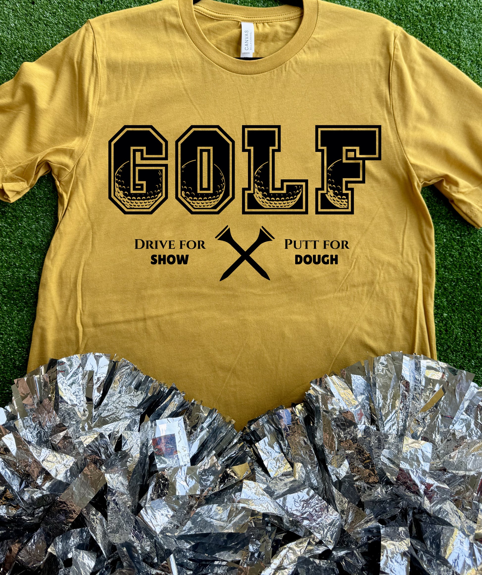 “Golf Drive for Show Putt for Dough” on a short sleeve Bella Canvas tee