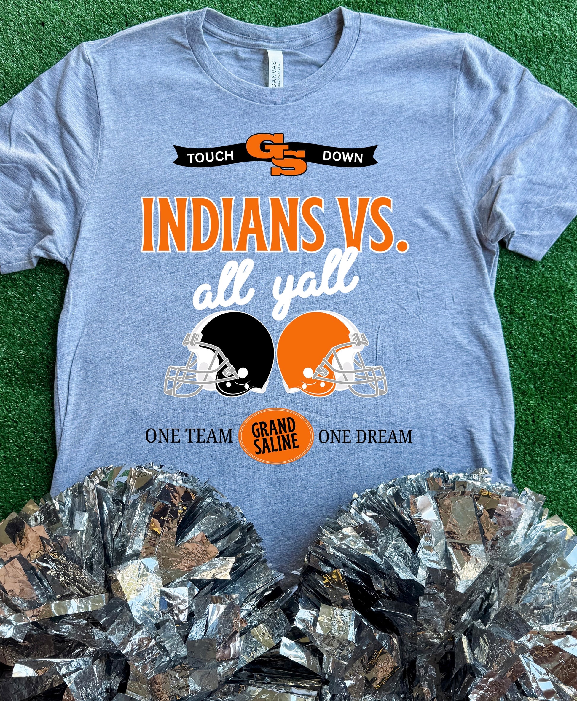 "Indians VS All Yall, One Team One Dream" on a Grey short sleeve Bella Canvas Tee