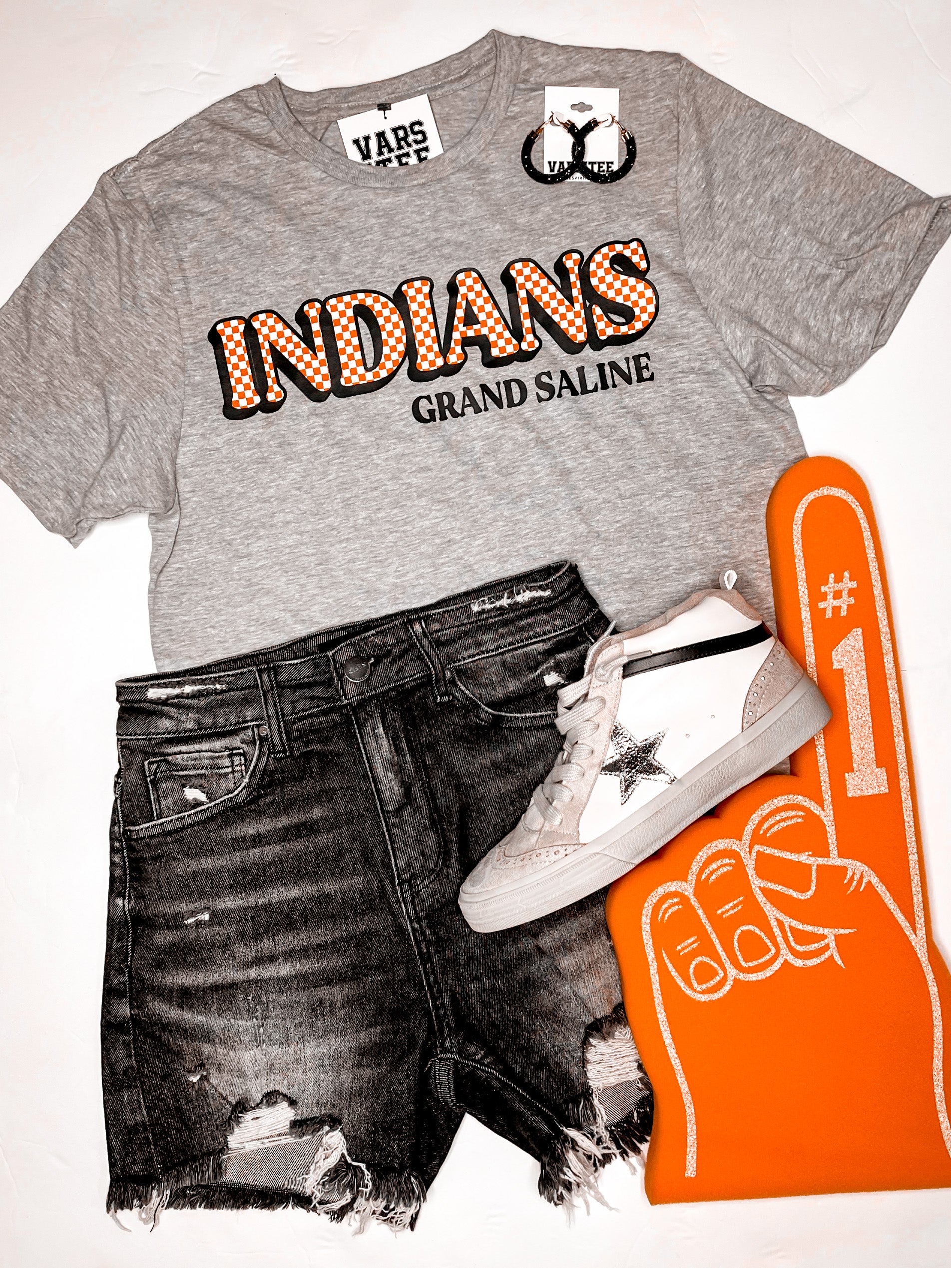 Checker Print Grand Saline Indians on a Grey Tee.