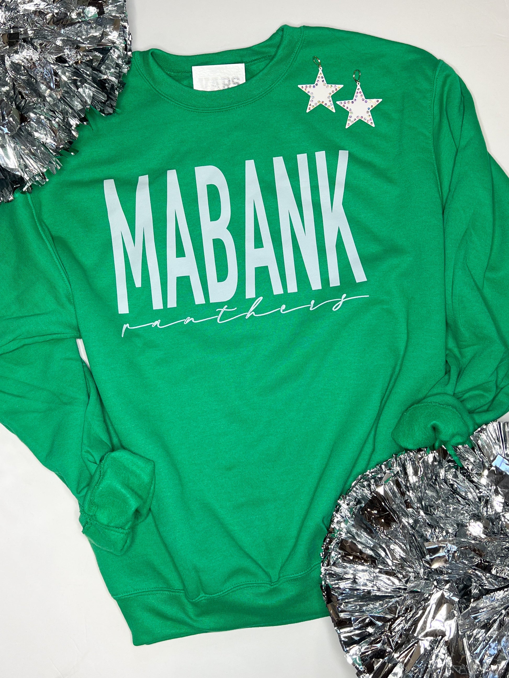 "Mabank Panthers" Script on a Kelly Green Sweatshirt.