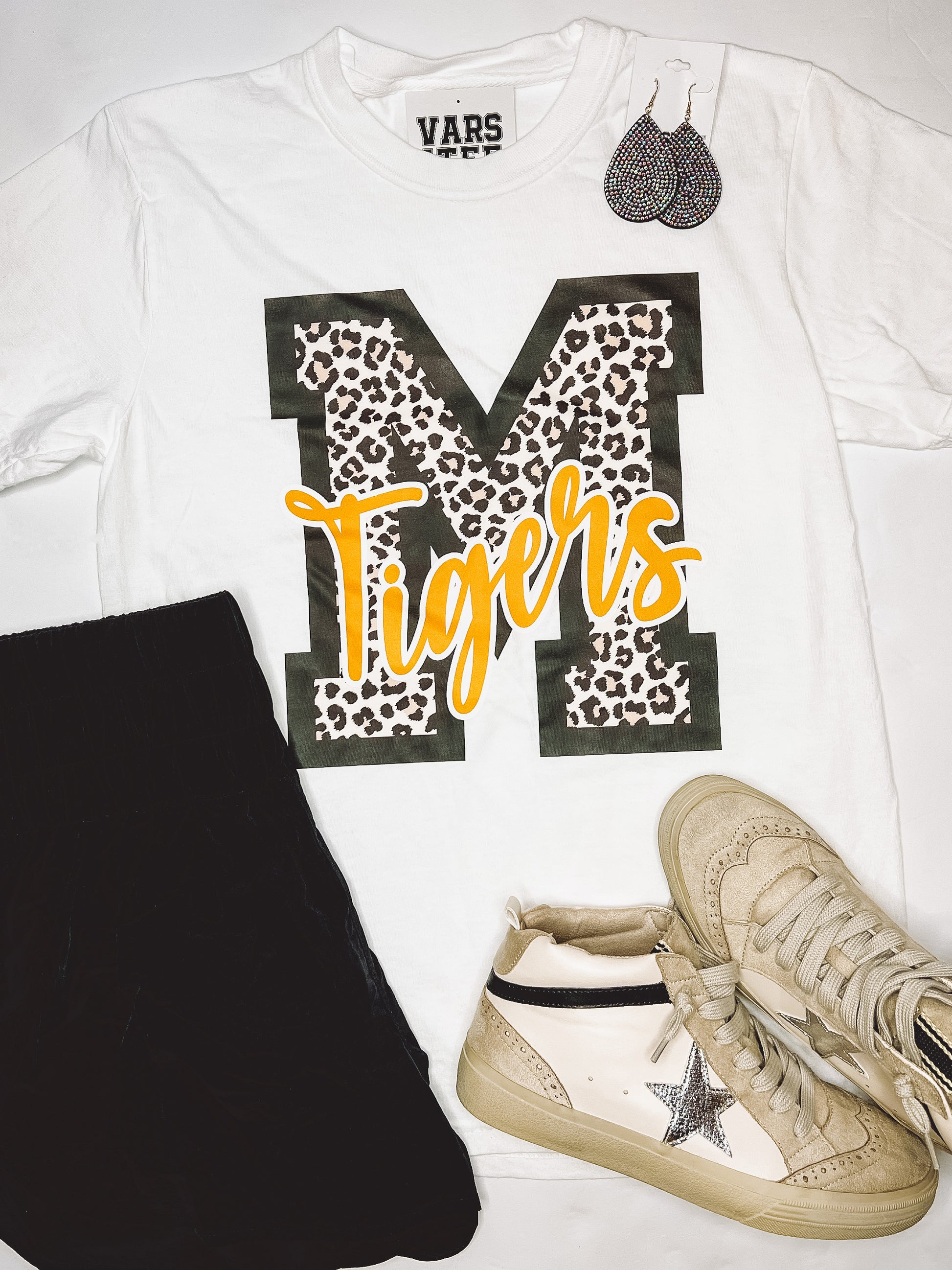 Leopard "M Tigers" on a White Comfort Colors Tee.