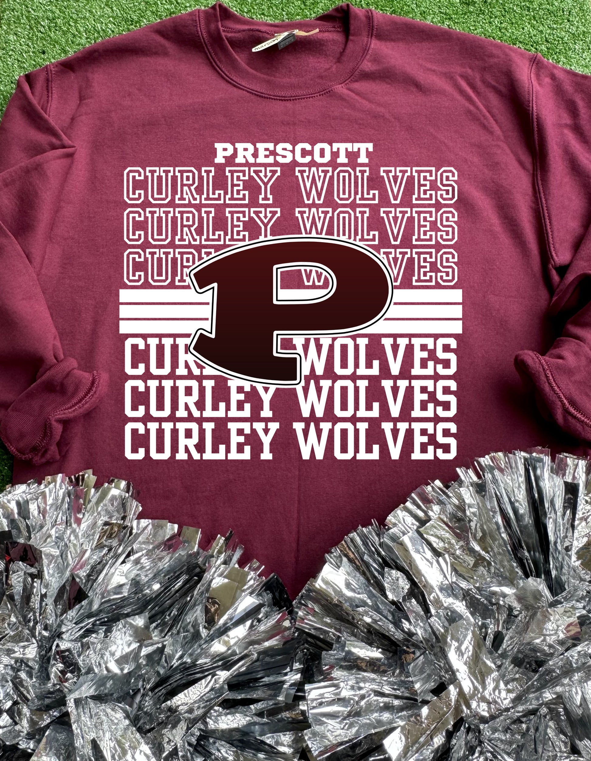 “Prescott Curley Wolves” on a Maroon Gildan Sweatshirt