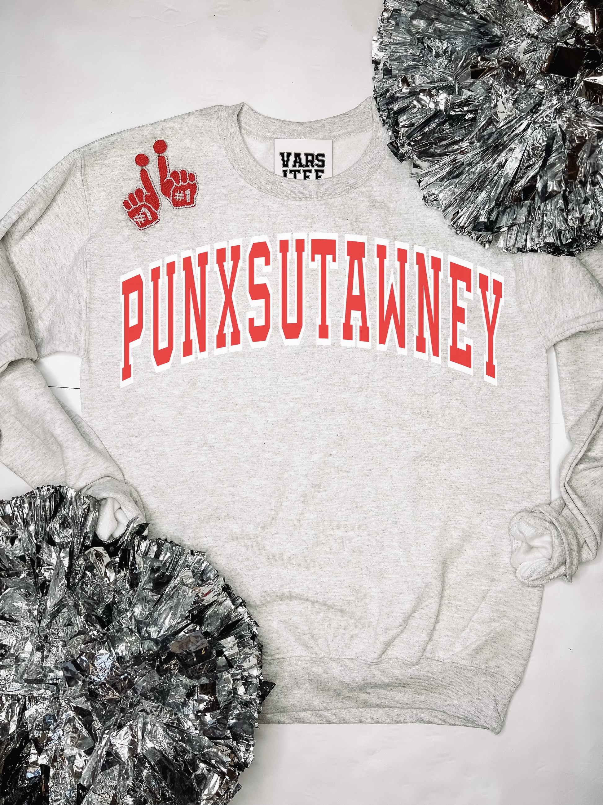 "Punxsutawney" Varsity Print on an Ash Grey Sweatshirt.