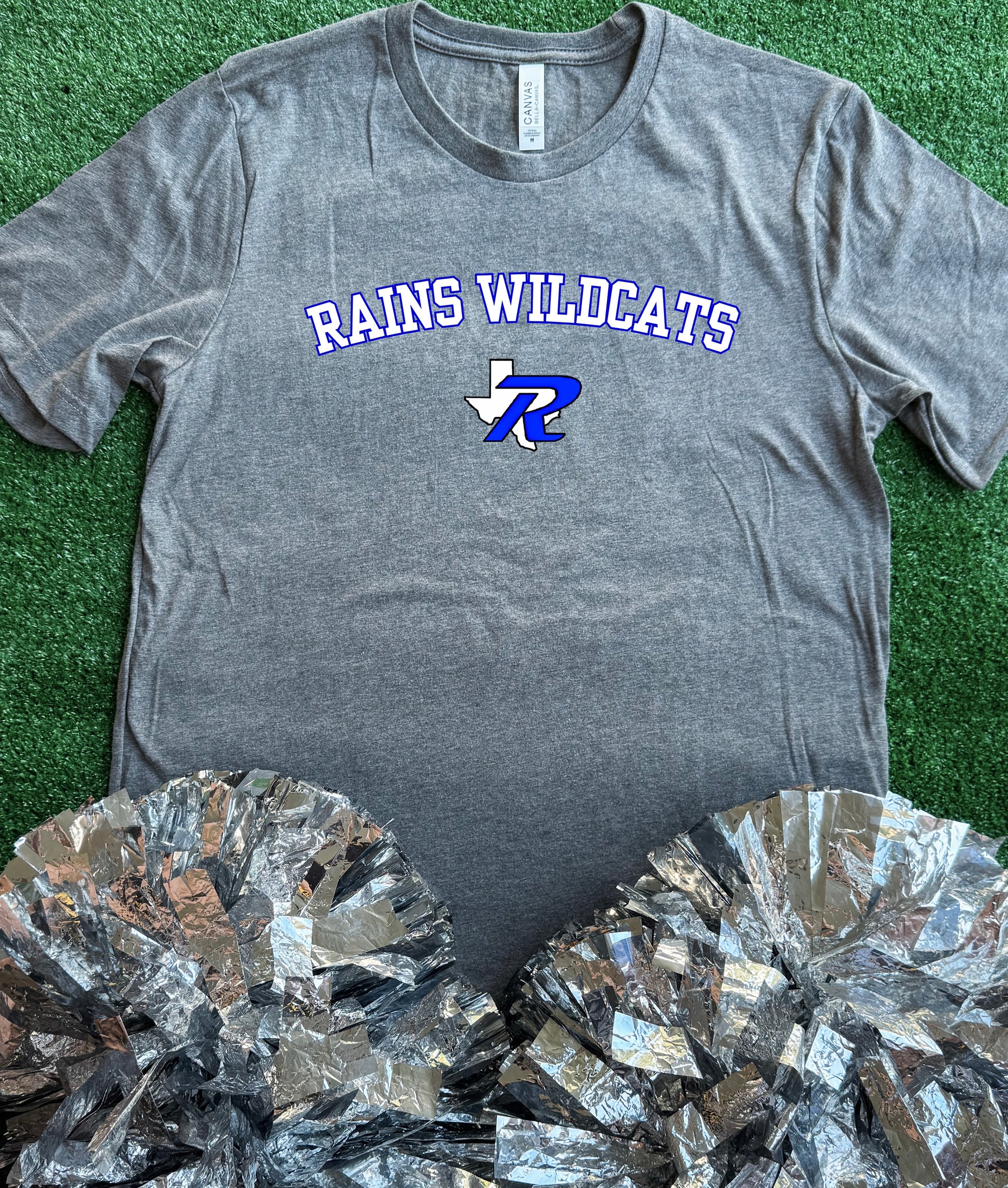 "Rains Wildcats Logo" on a gray short sleeve Bella Canvas tee.
