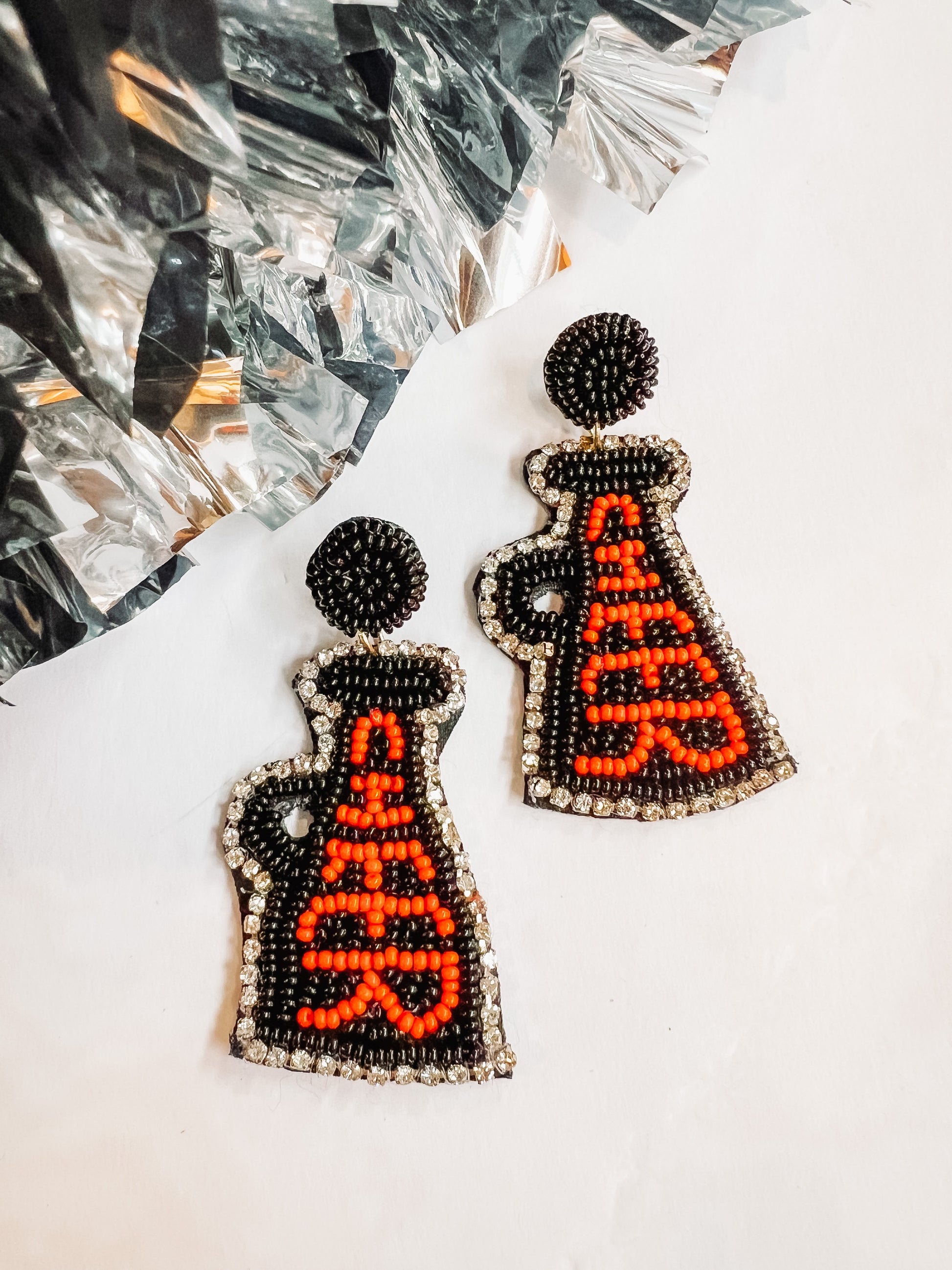 Black Beaded Cheer Megaphone with Rhinestone Detail.