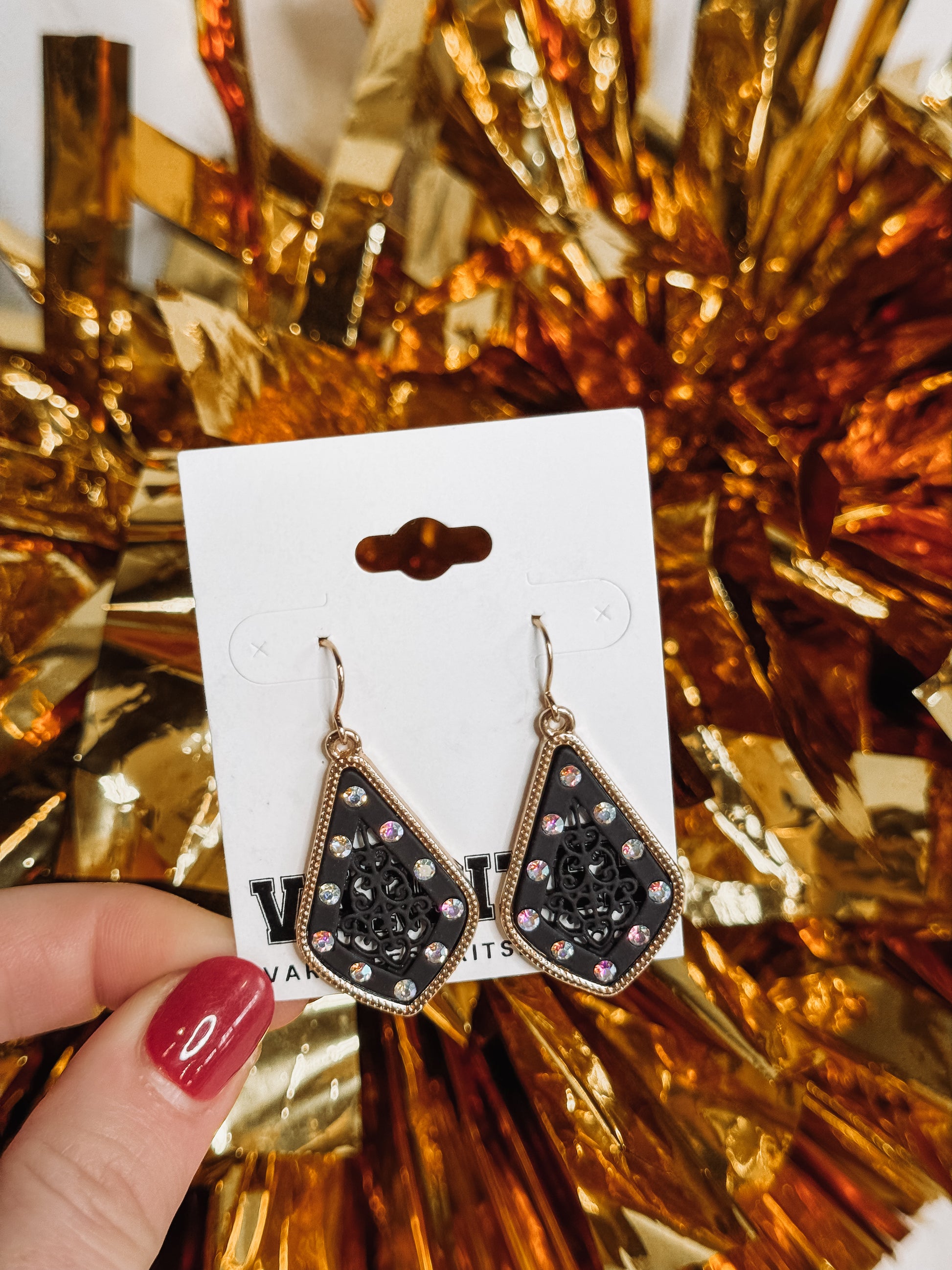 Small Black Metal Drop Earring with Rhinestones and Gold Setting.