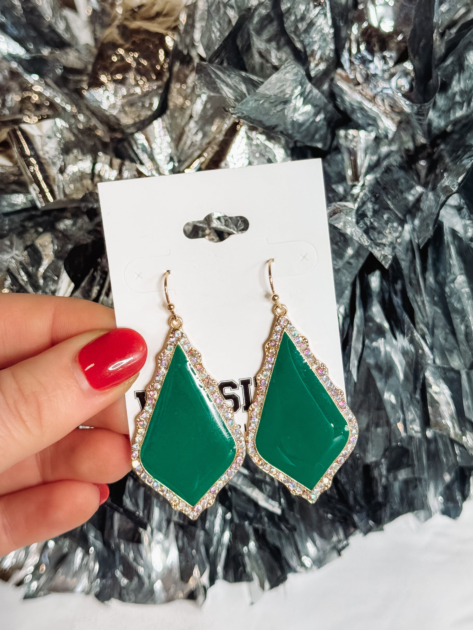 Green Stone Drop with Rhinestone Setting.