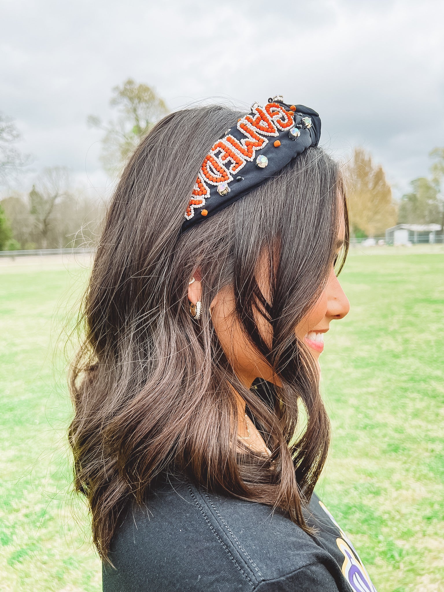 Black Knot Headband with Orange and White Beaded GAMEDAY Detail.