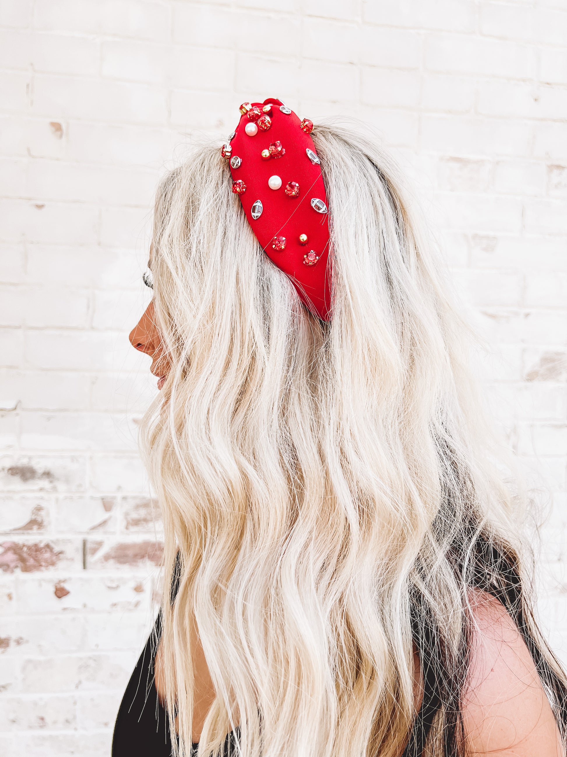 Red Knot Headband with Rhinestone, Football & Pearl Detail.
