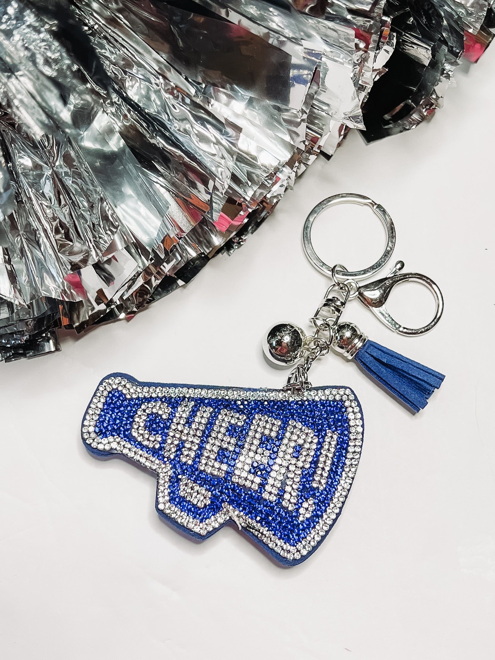 Blue Rhinestone Cheer Megaphone Keychain.