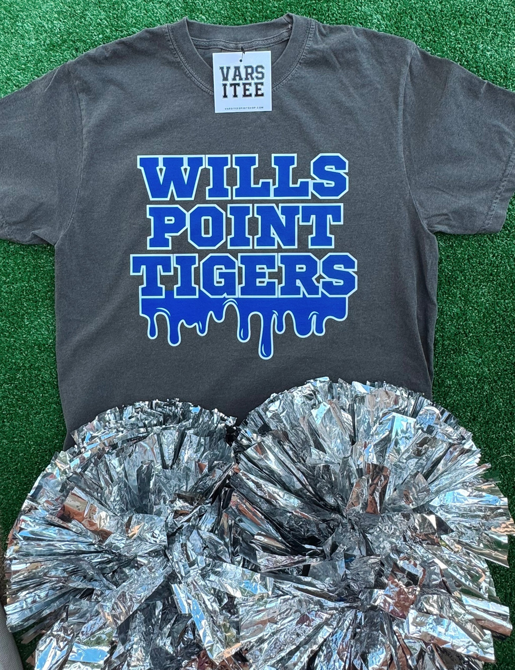 "Wills Point Tigers" on a Dark Grey Comfort Colors tee
