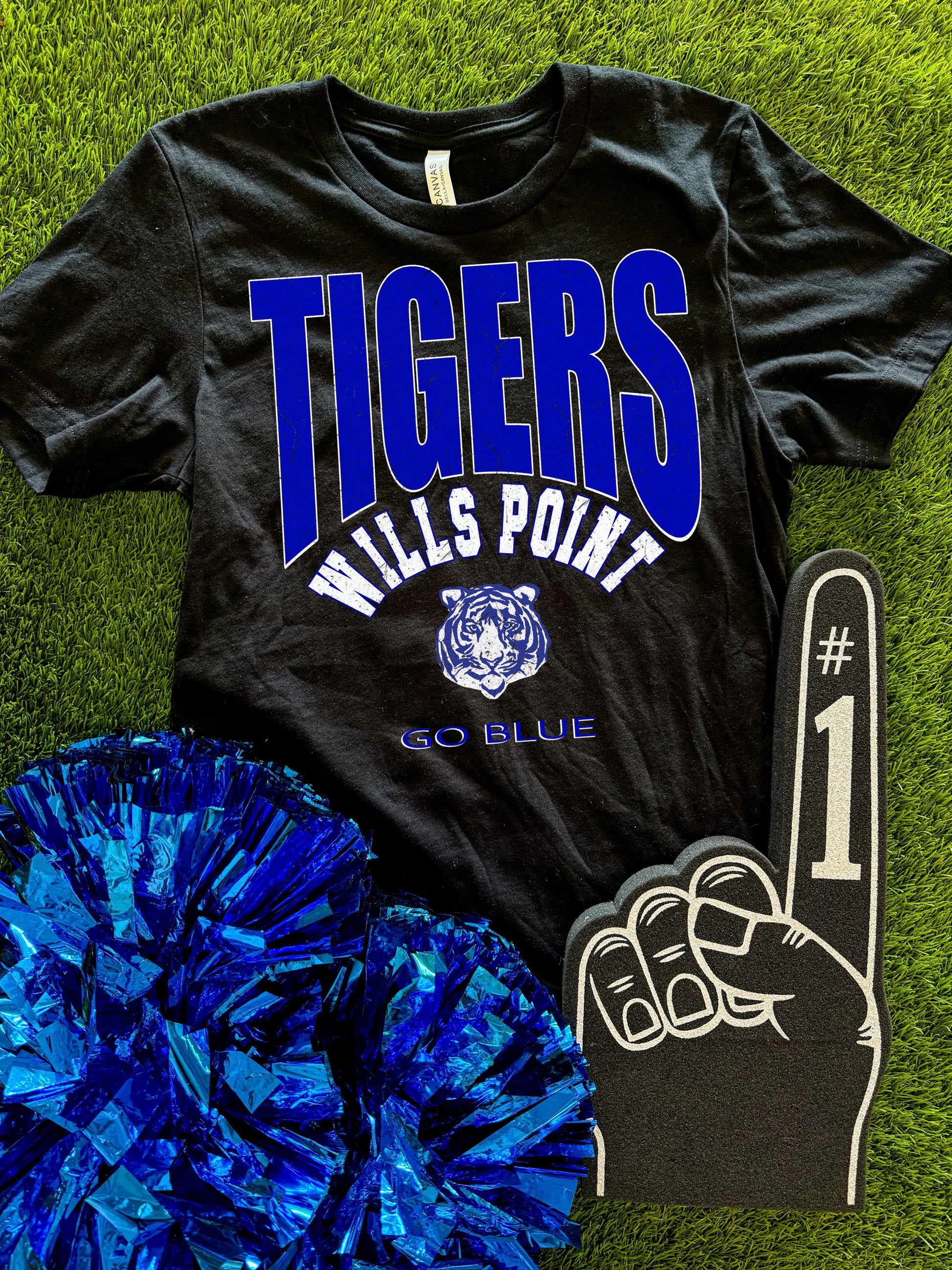 “Wills Point Tigers, Go Blue” on a Black Short Sleeve Bella Canvas Tee