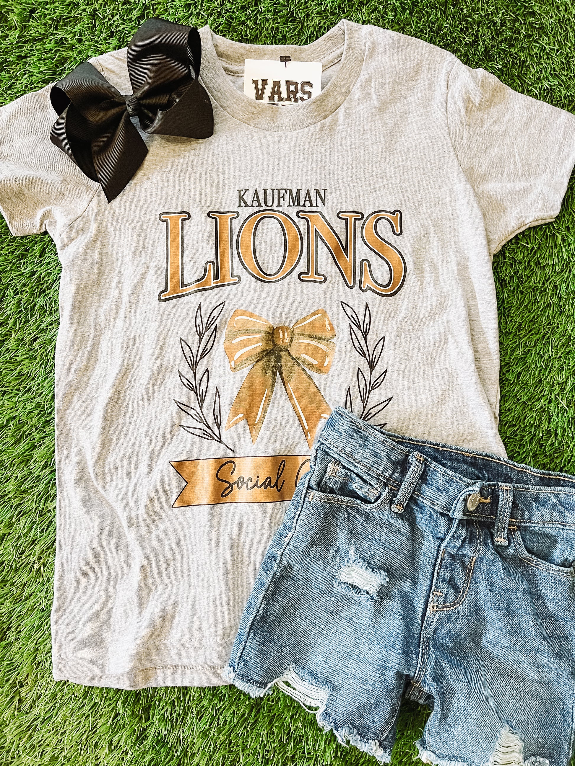 Kaufman Lions Social Club Graphic on a Grey Bella Canvas Tee.